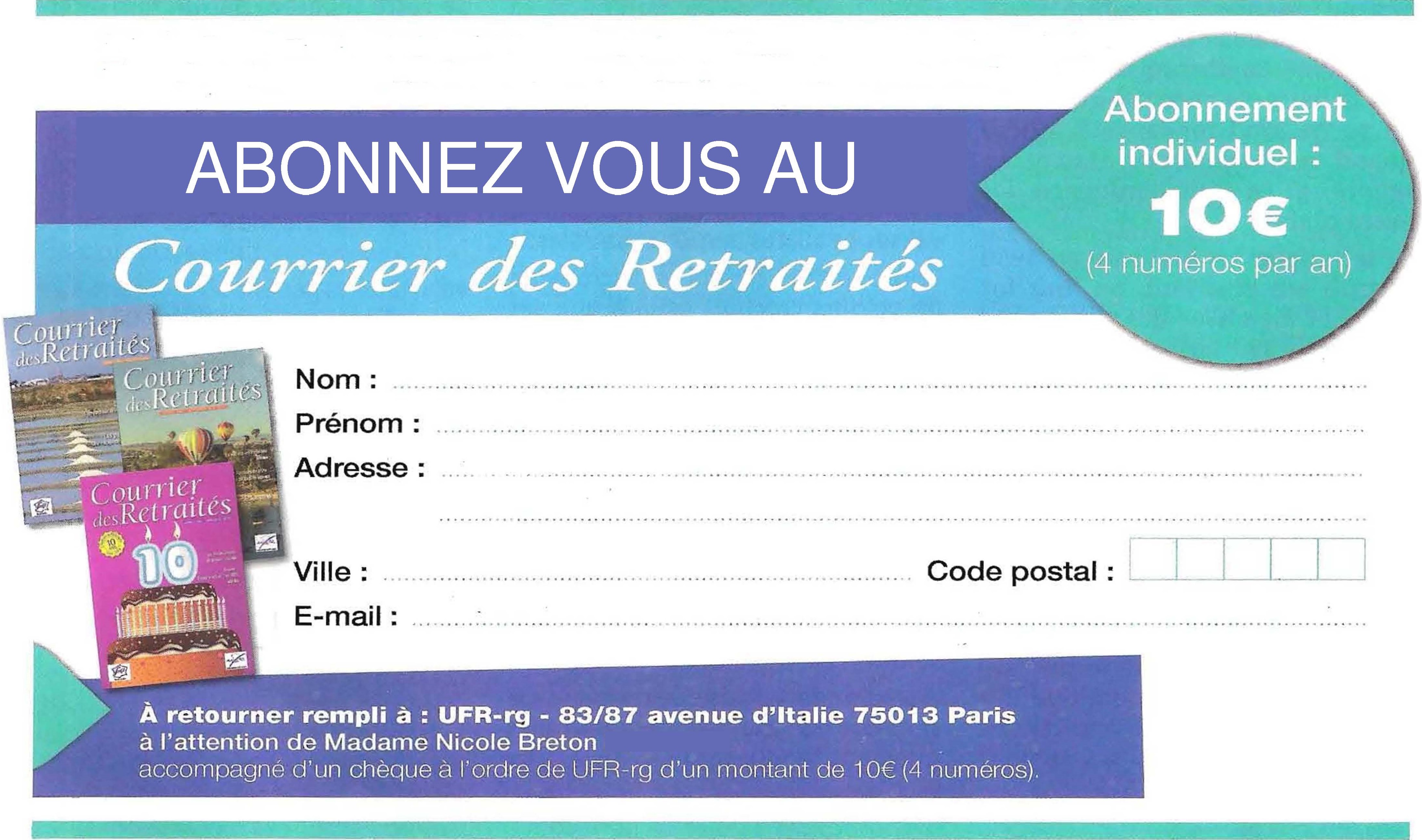 Votre abonnement annuel au Courrier des Retraités (4 numéros trimestriels en mars, juin, septembre et décembre) pour un montant de 10€ réglable en espèces, chèque, virement, carte bancaire ou paypal