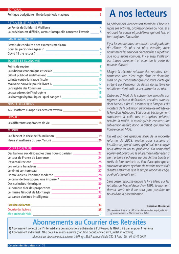 Le Courrier des Retraités est une revue trimestrielle éditée par l’Union Française des Retraités-rg. Comme la fédération qui la patronne, cette revue est sans attache politique, syndicale, religieuse ou autre. Elle s’inscrit dans les politiques définies par l’UFR-rg, sa fédération et défend les intérêts des retraités et personnes âgées et c’est assurément un support utile pour les préretraités et futurs retraités.